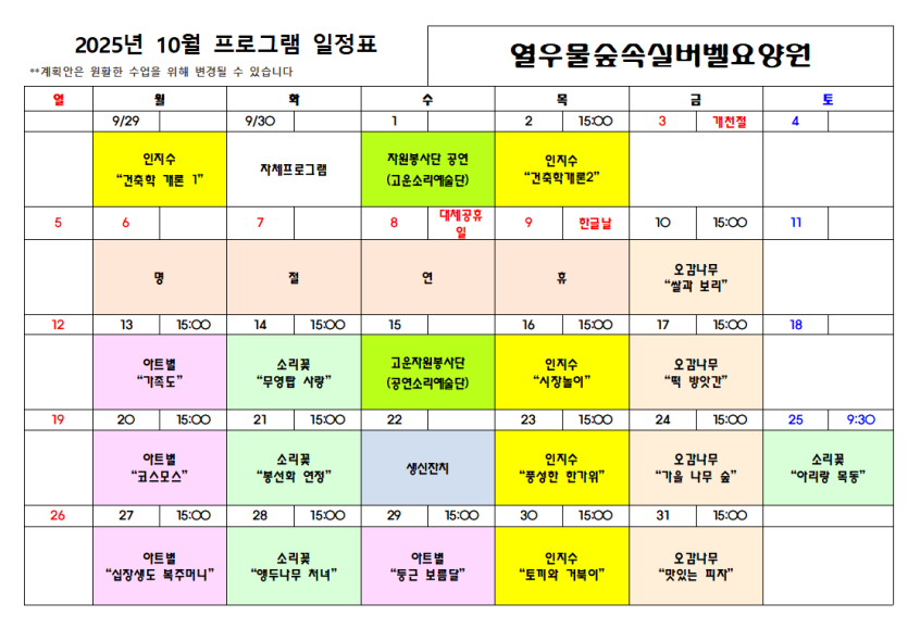 2025년 10월 열우물숲속실버벨요양원 프로그램일정표입니다.